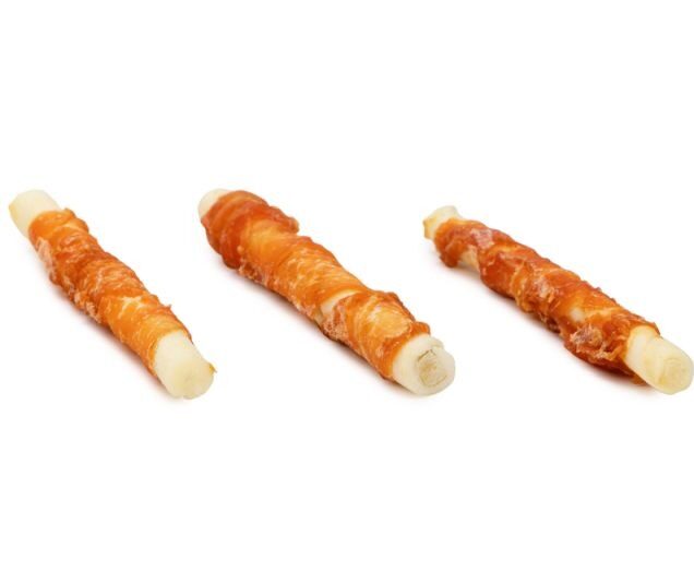 Descubre nuestros deliciosos rollitos de piel de vacuno recubiertos con filete de pollo, diseñados especialmente para premiar y entretener a tu perro. Con una piel extra gruesa, estos snacks ofrecen una mayor duración.